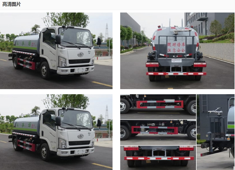 國(guó)六解放5噸灑水車,罐體容積5立方米,該車具有免征公告(可免交車輛購(gòu)置稅)。采用武鋼4mm優(yōu)質(zhì)碳鋼板一次卷壓成型,完全做到無(wú)縫成型。罐體內(nèi)設(shè)多道防波隔板,采用高壓氣體試漏檢測(cè),使罐體具有強(qiáng)度高,重心穩(wěn),車輛運(yùn)載安全平穩(wěn)。罐體外表為烤漆,罐體及各保險(xiǎn)杠貼紅白色視覺反光條,罐體兩側(cè)噴“綠化灑水車”字樣(可按您的要求噴繪字樣),罐體顏色出廠為上白下綠或上白下藍(lán)(可按您的要求噴繪顏色)。采用CA1070K2L3E6B底盤,錫柴130馬力發(fā)動(dòng)機(jī),外形尺寸:6200,5995 * 2000 * 2400,2700  (mm),六檔變速箱,總質(zhì)量(kg) 7360 額定質(zhì)量(kg) 3930 整備質(zhì)量(kg) 3300 ,軸距3360mm,配40-50大功率水泵,帶前噴,后灑,側(cè)噴,水炮,后工作平臺(tái)。