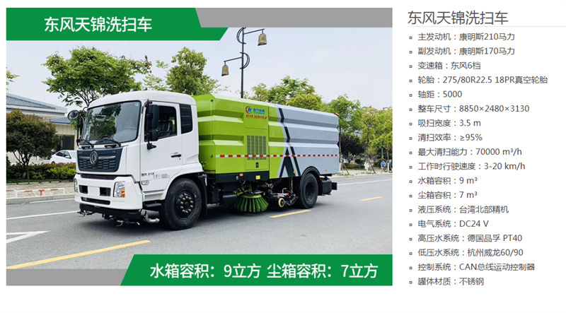 東風(fēng)18噸洗掃車,帶2個(gè)中置掃盤,天錦為康明斯170馬力副發(fā)動(dòng)機(jī);三洋馬達(dá);高壓水泵(前沖/側(cè)噴/中噴/后噴霧/沖洗水槍/垃圾箱自潔裝置);高壓路沿清洗噴頭,低壓泵(前沖);不銹鋼垃圾箱;控制器;控制箱;PLC一鍵控制;尾部LED箭頭燈;垃圾箱、水箱均帶防溢低水位報(bào)警裝置;倒車及洗掃狀態(tài)室內(nèi)監(jiān)視器。20m高壓沖洗卷盤。