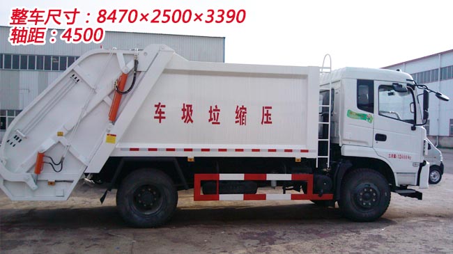 東風(fēng)特商壓縮式垃圾車,采用東風(fēng)D193-3駕駛室,配備東風(fēng)康明斯發(fā)動機(jī),8JS85變速箱,軸距4.5米。3.6噸前橋,10噸后橋,10.00R20鋼絲胎,帶ABS?杉友b行車記錄儀,電動玻璃,兩點(diǎn)懸浮,液壓反轉(zhuǎn)。