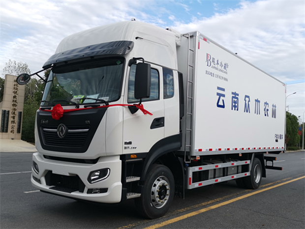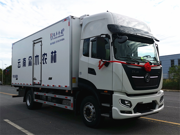 東風天錦6米8冷藏車-國六290馬力,整車型號為:DFH5180XLCEX7,發(fā)動機型號為:D6.7NS6B290,整車外形尺寸:9200×2600×3960mm,箱體尺寸6800×2440×2450mm,總質(zhì)量:18000Kg,整備質(zhì)量:7880Kg,額定質(zhì)量為:9990Kg.